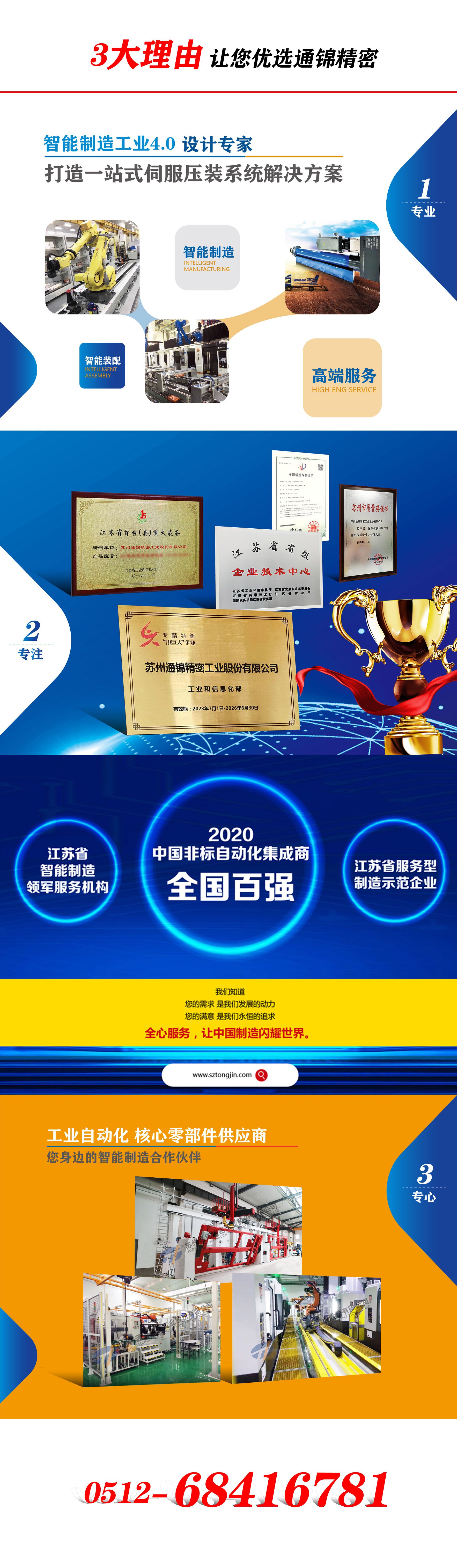 多年來公司一直以“工廠實現綠色無人化”為愿景;以“通向世界、錦繡中華”為使命;以“創新、進取、誠信、和諧”為企業核心價值觀。公司在引進國外高尖端自動化核心元件的基礎上,大力投入研發資金,主要針對新能源汽車,光伏、5G、儲能電池等行業智能伺服裝配技術需求,已成功自主研發、設計、組裝、銷售通錦牌伺服電動缸、智能伺服壓裝機、第七軸機器人、(重型)桁架機器人等自主產品,結合六關節機器人實現自動化、安全化、無人化的智能裝配綠色無人化生產線,提供一站式工廠智能裝配自動化系統整體解決方案,實現工業4.0。同時為客戶提供高端貿易品牌工控核心零部件:意大利Gambini齒輪齒條、Panasonic伺服系統、Rexroth變頻器、Nidec減速機、APEX減速機。